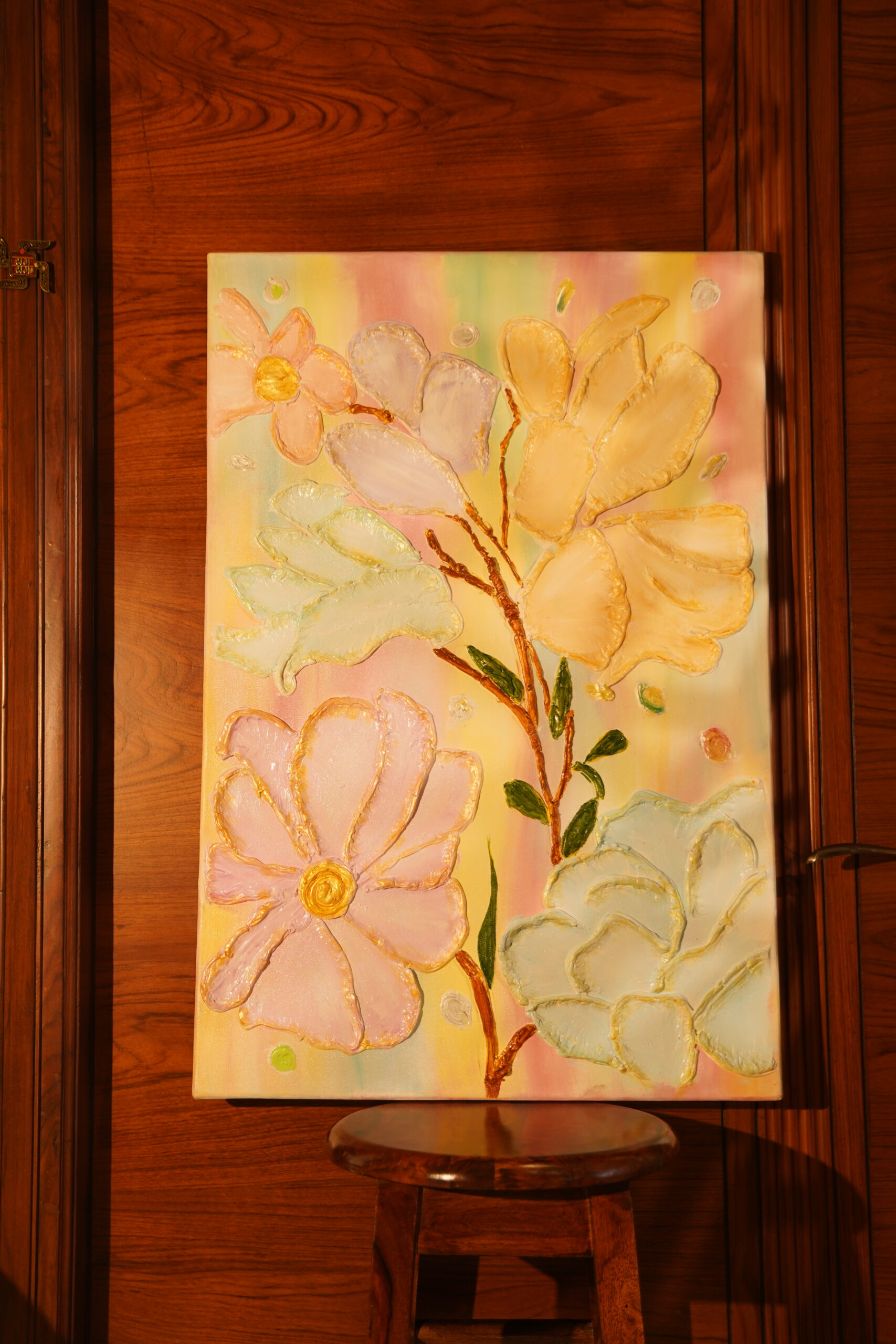 “Wings of Bloom” captures the delicate balance between transformation and grace. The butterfly, symbolizing freedom and rebirth, unfolds its wings woven with blossoms – a harmony of nature and motion. The textured floral detailing represents growth and beauty emerging from within, while the soft pink hues evoke a sense of calm, femininity, and renewal. Each petal and stroke defines the change as a form of art – ever-evolving, ever-beautiful.