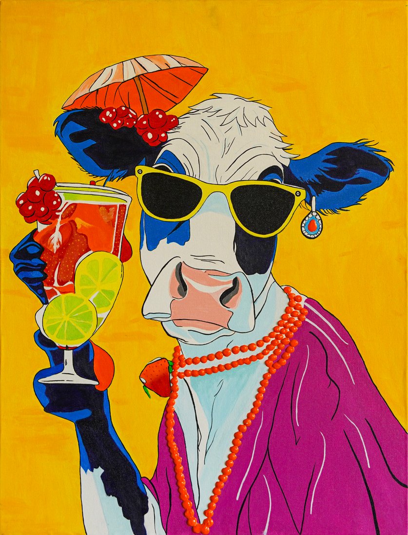 It pauses for a “moo-ment,” glass in hoof, savoring the joy of now. Dressed in vibrant colors and effortless confidence, this cow embodies celebration that is playful, stylish, and delightfully unexpected.