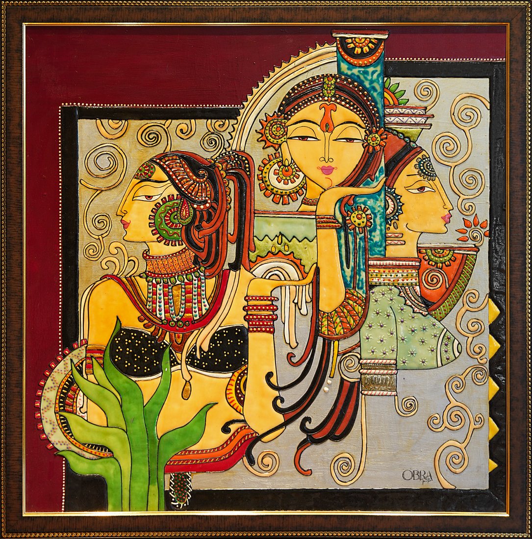 An ode to feminine divinity and serenity, Divine Grace portrays three goddess-like figures embodying strength, compassion, and wisdom. The vibrant palette of saffron, turquoise, and maroon reflects India’s spiritual richness, while intricate patterns honor the timeless beauty of tradition.