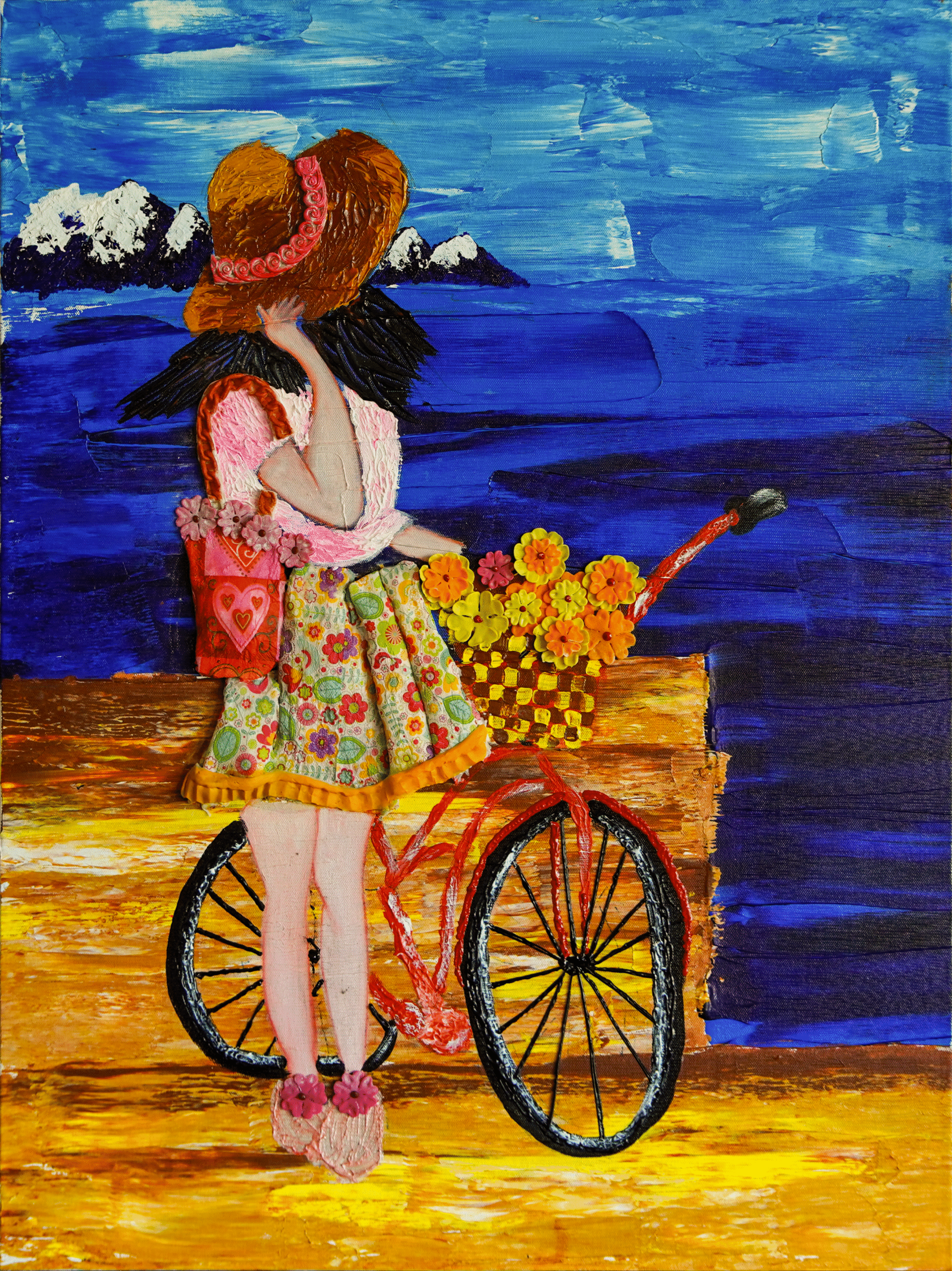At the meeting point of water and wonder, she stands quietly, her bicycle beside her like a faithful companion of countless unseen miles. It carries the weight of journeys taken and the promise of those yet to come. From its basket, flowers spill gently, as if they are pieces of happiness gathered along the road—small moments, simple joys, memories she chose to keep. Before her stretches an endless blue horizon, calm and inviting, whispering possibilities rather than destinations. Wrapped in soft colors and quiet light, she pauses—not out of hesitation, but in reflection.