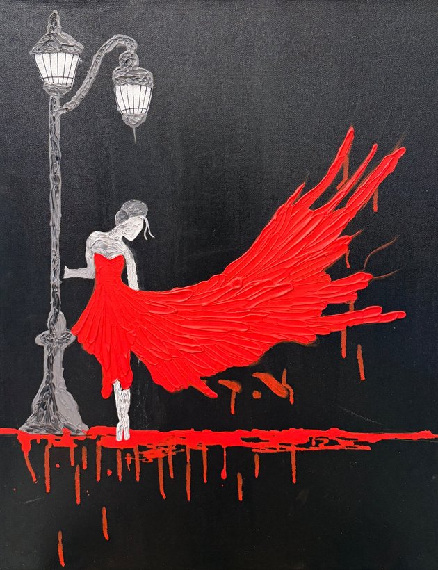 This painting captures the moment just before becoming β where hope begins to take shape and intention learns how to breathe. The crimson tones speak of courage and longing, while the gentle movement around her suggests ideas unfolding, unafraid to rise.
