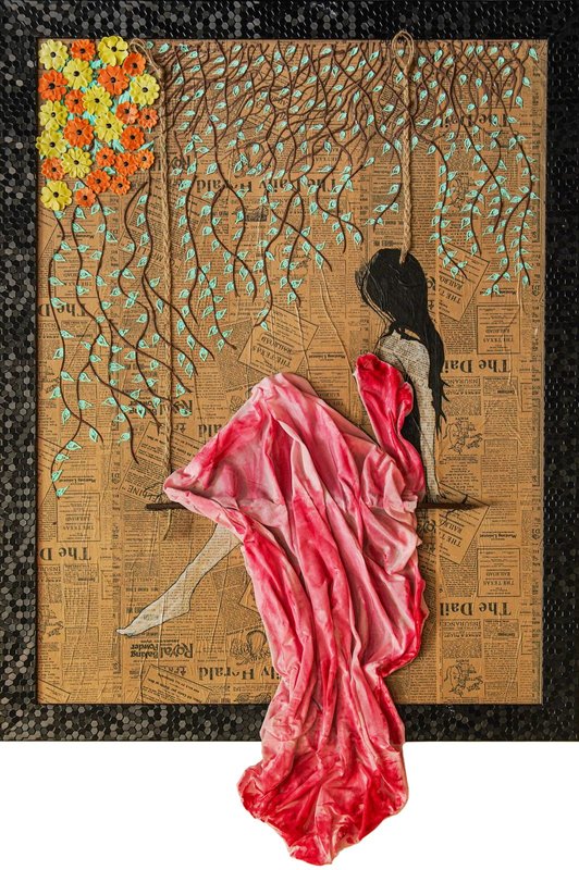 She sits within a silence shaped by forgotten words and yesterday’s news. Loneliness lingers softly, like vines that fall without sound, present yet uninsistent. The red fabric gathers what the heart cannot place anywhere else — warmth, memory, and the quiet weight of feeling.