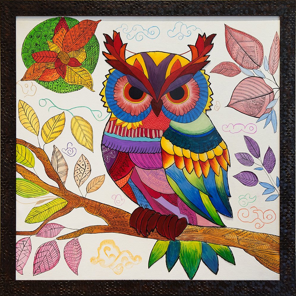 Perched between colour and calm, this owl feels like a gentle guardian of untold stories. Every feather carries a different hue, as if wisdom itself has chosen to dress in joy rather than silence. The wide, watchful eyes do not judge — they simply observe, patient and knowing. Surrounded by drifting leaves and playful patterns, the piece suggests that wisdom does not always arrive in solemn tones. Sometimes, it comes alive in colour, curiosity, and quiet attentiveness — reminding us that true insight often blooms when we pause long enough to listen.
