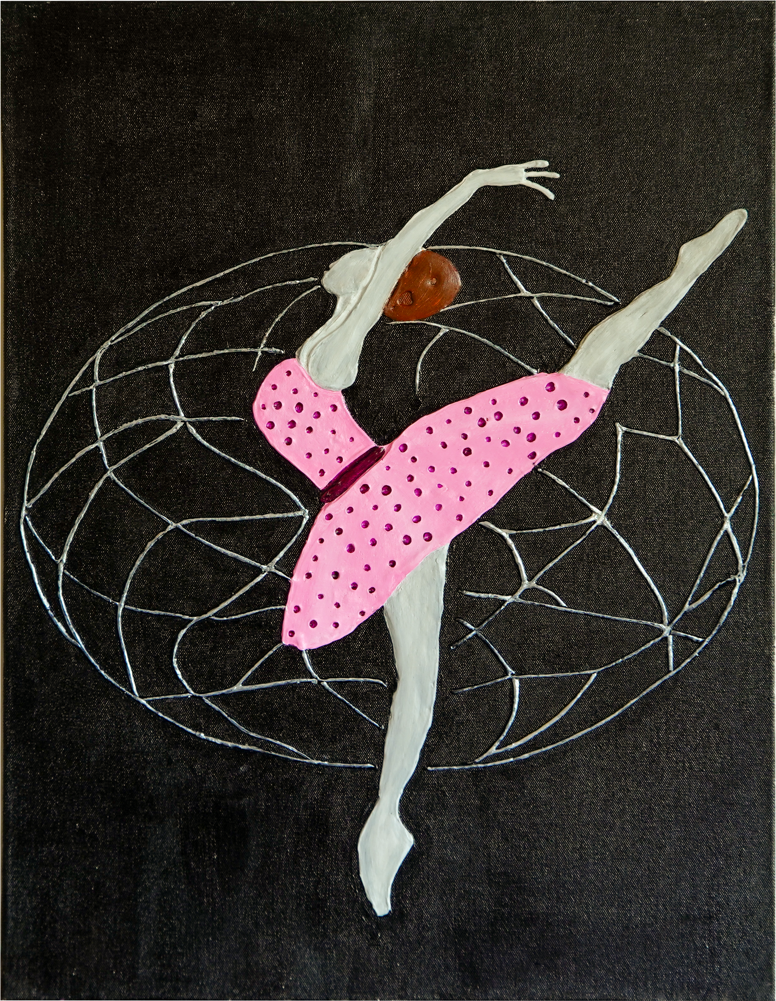 Set against a deep, silent backdrop, the dancer appears to exist between stillness and motion, as if suspended in a space where time briefly pauses. One foot holds her gently to the present, while the other reaches outward, searching for freedom beyond the visible. Her flowing pink dress captures the poetry of movement, frozen for a moment yet alive with energy.