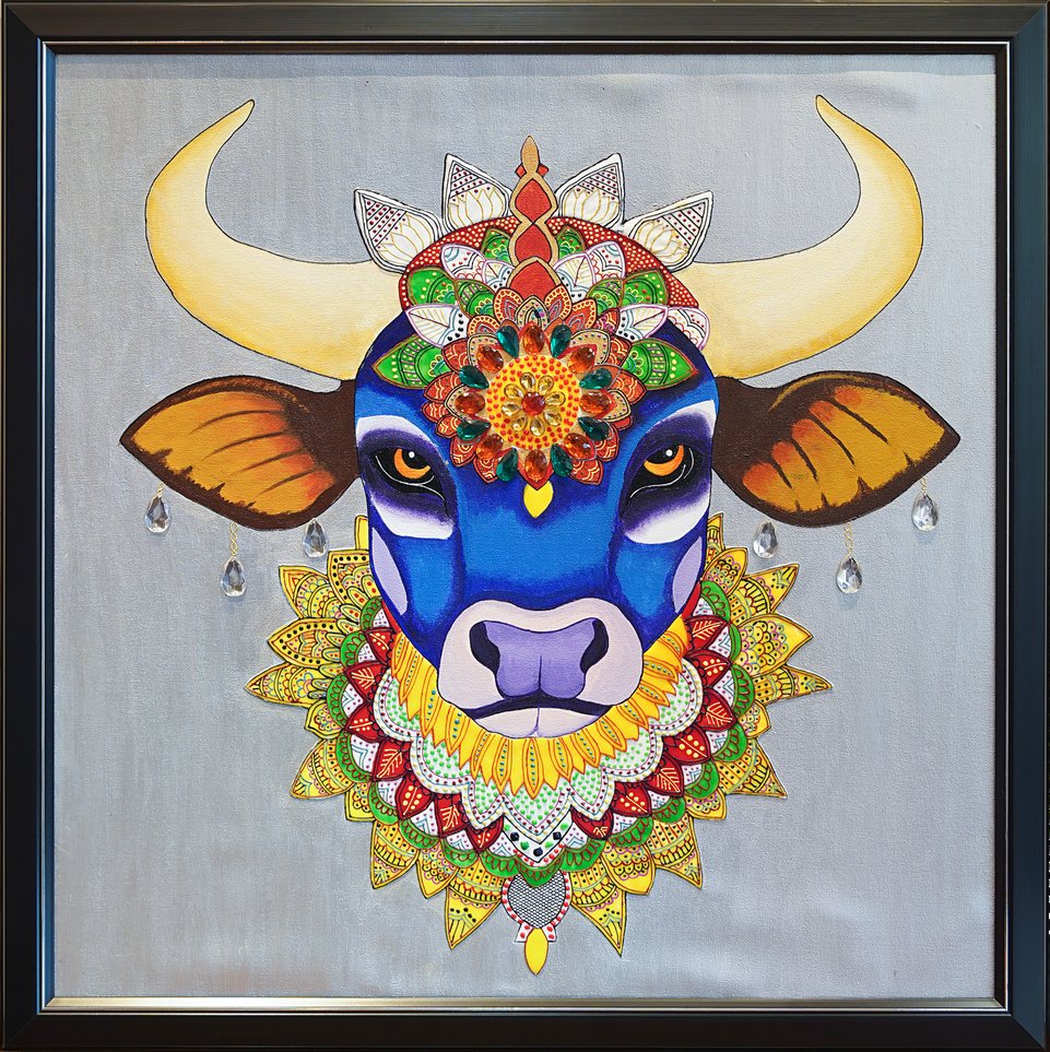 This artwork captures the serene majesty of Nandi, the sacred vahan of Lord Shiva, embodying strength, devotion, and timeless grace. Nandi stands as a symbol of unwavering loyalty, his calm and steady gaze reflecting patience and inner power that needs no assertion. Every detail of the painting celebrates this sacred presence — the carefully adorned jewelry glimmers not as a display of wealth, but as a testament to devotion, reverence, and the dignity earned through faithful service.