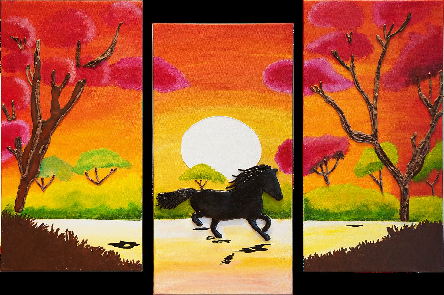 This Painting Captures a Moment Where the Earth Opens Wide and the Spirit Chooses Motion. The Horse Moves With Unrestrained Grace, Carrying the Pulse of Independence Across Glowing Skies and Softened Land. Each Panel Unfolds Like a Breath β€” Colour Deepening, Light Widening, Energy Flowing Forward. There is Strength Here, but Also Peace. A Sense of Belonging Not to a Place, but to the Journey Itself. The Piece Speaks of Instinct, Courage, and the Quiet Joy of Moving Freely β€” Guided Only by Light, Rhythm, and the Promise of Open Ground Ahead.