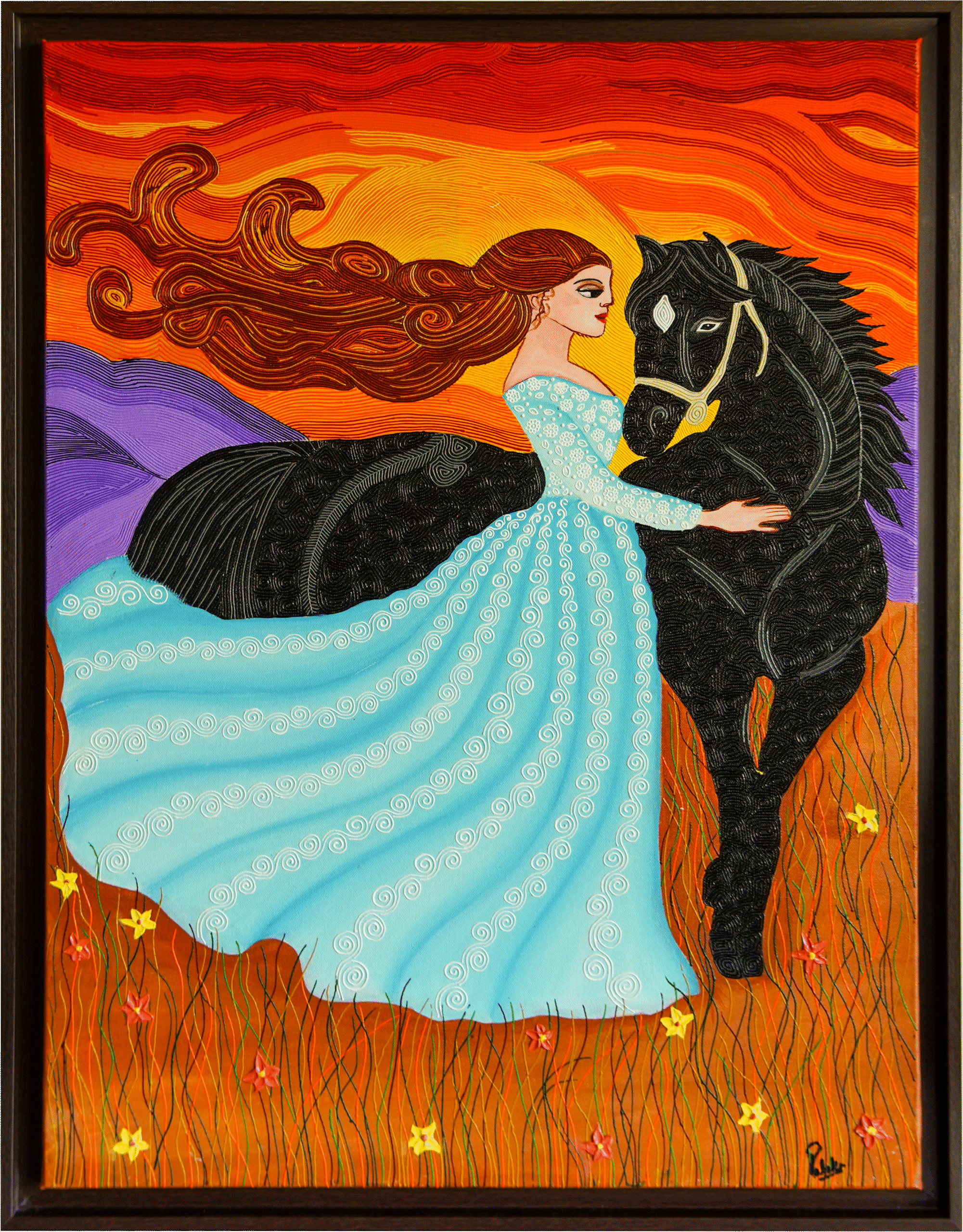 As the sun dissolves into a sky painted with fire and gold, she walks through the tall grass beside the one presence that understands her without a single word. The black horse moves with quiet strength, steady and calm, holding her unspoken fears, hidden dreams, and restless spirit.