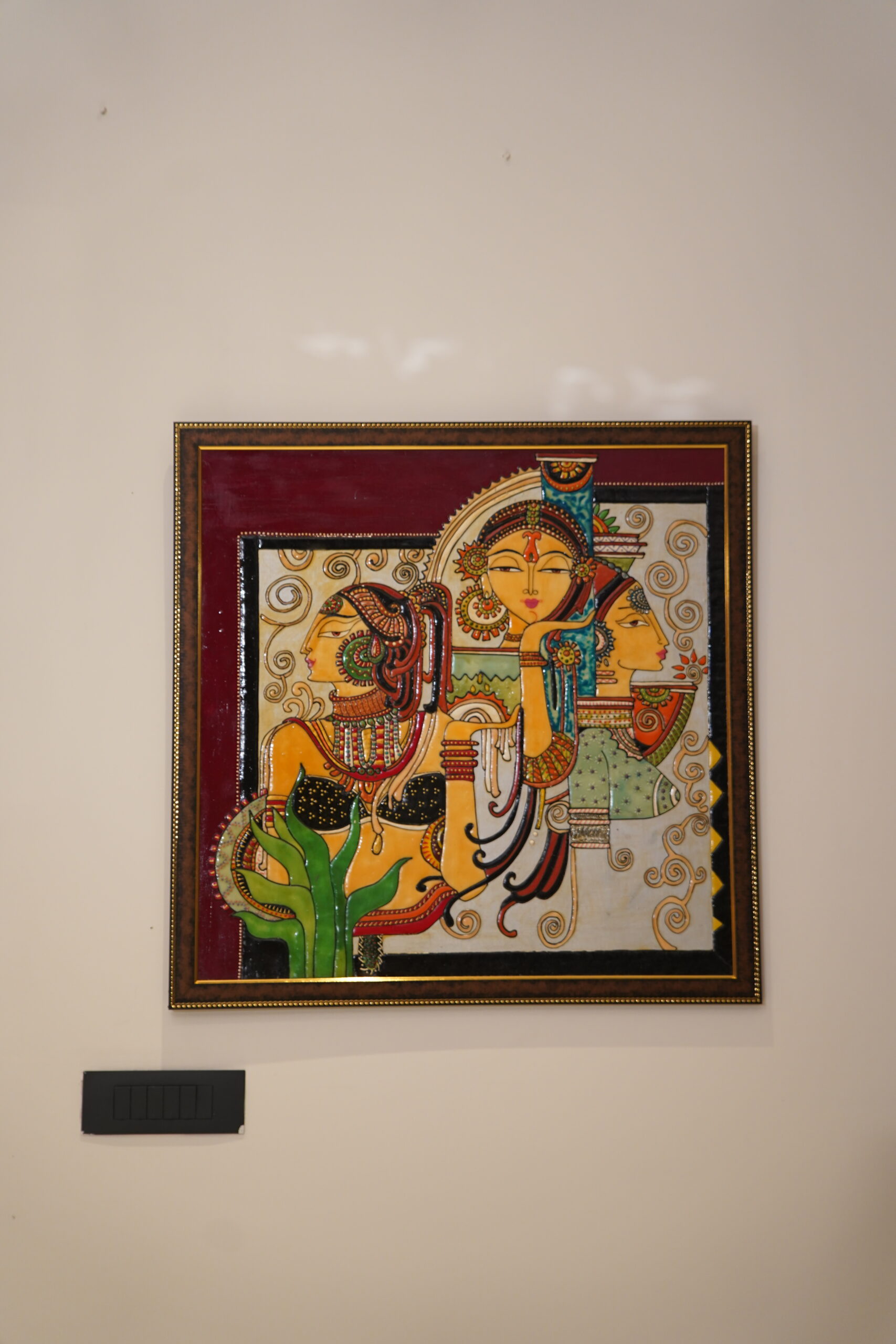 An ode to feminine divinity and serenity, Divine Grace portrays three goddesses-like figures symbolizing strength, compassion, and wisdom. The vibrant palette of saffron, turquoise, and maroon evokes India’s spiritual richness, while intricate patterns celebrate the eternal beauty of tradition. The artwork invites the viewer into a meditative world where elegance meets devotion.