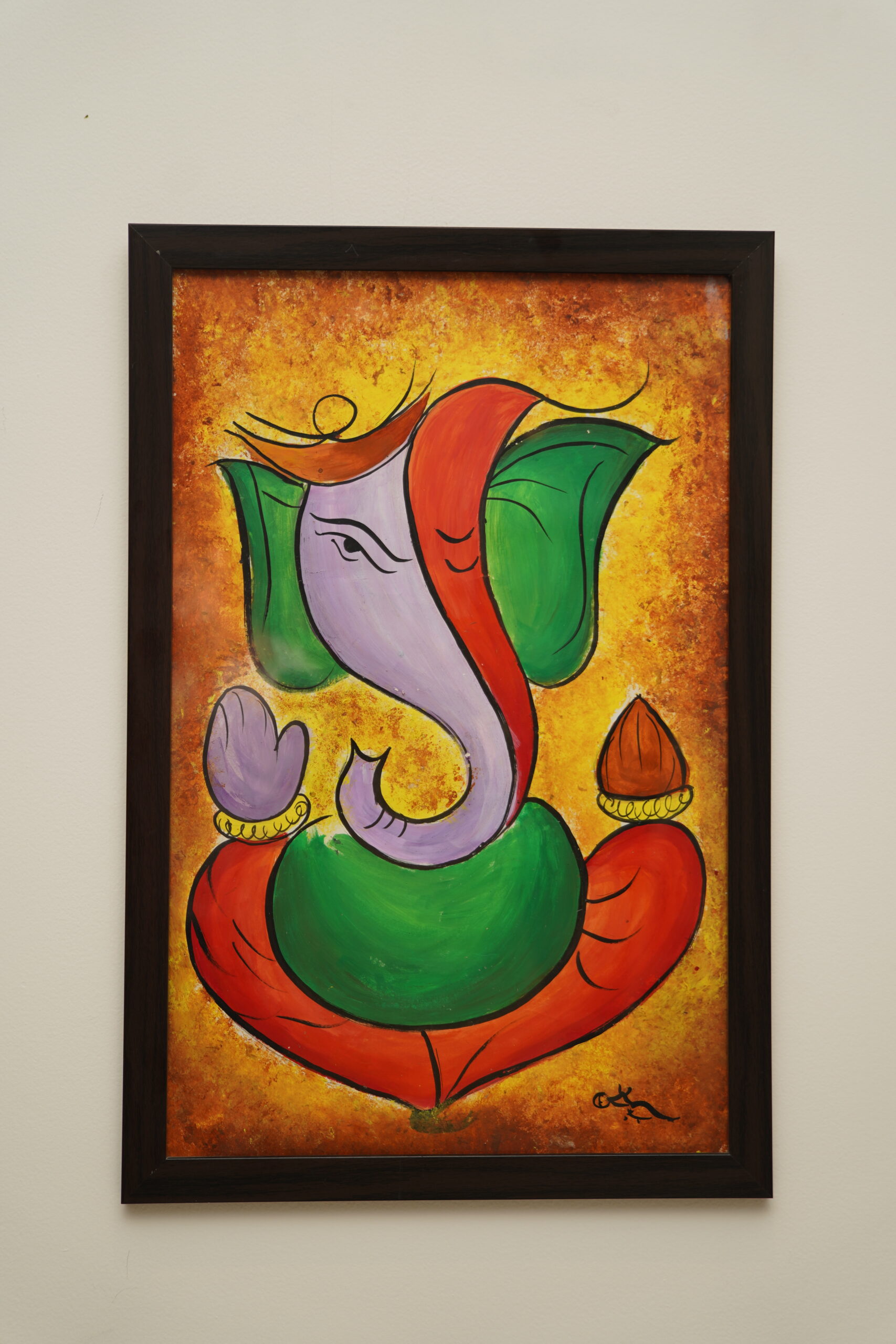Before brush meets canvas or footsteps echo on polished floors, the studio awakens under Ganesh’s watchful gaze. Bathed in molten gold and gentle greens, this portrait becomes a whispered prayer for wisdom and grace. Every curve sings of beginnings, every hue of hope. Let this presence bless each creation born within these walls, weaving silent assurance into the heart of OBRA’s journey.